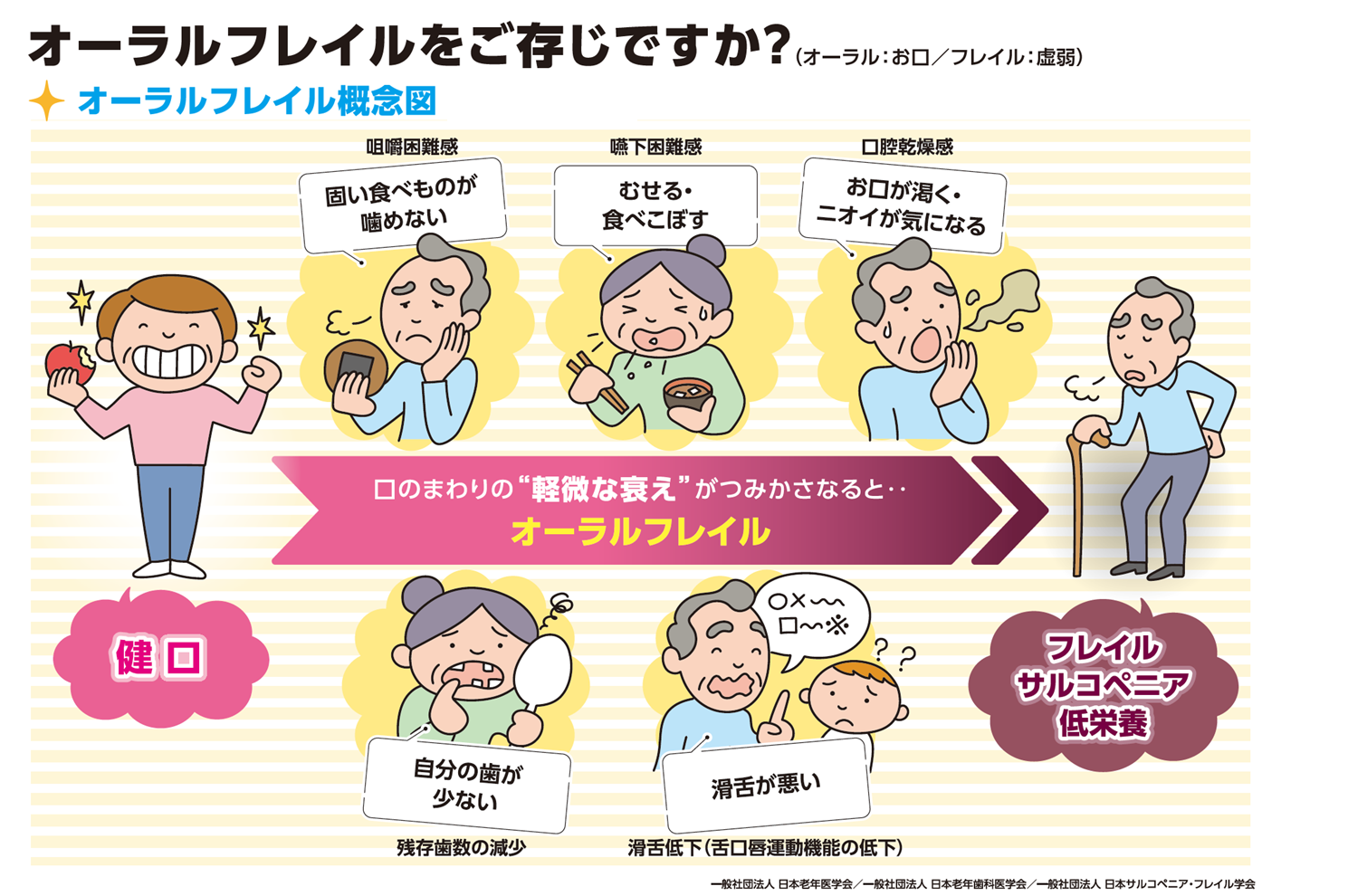 口腔機能低下症(オーラルフレイル) 皆さん口腔機能低下症(オーラルフレイル)って知っていますか?? 口の機能が衰えると全身の機能も落ちていくといわれています。 口腔機能低下症はオーラルフレイルは4年後の要介護リスクが2.35倍、死亡リスクが2.09倍といわれています。 当院では口腔機能精密検査も行っております。お口の健康を守りいくつになっても健康でいられるサポートが出来ればと考えております。 ご気軽にご相談ください。